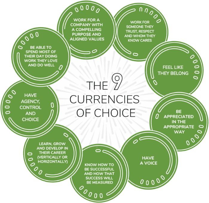What are the 9 Currencies of Choice? The 9 Currencies of Choice is a model developed by Kim Seeling Smith in 2010, reverse engineered from over 5,000 exit interviews, identifying the nine things people fundamentally need from their work experience. It is pressure tested annually against the latest international research.